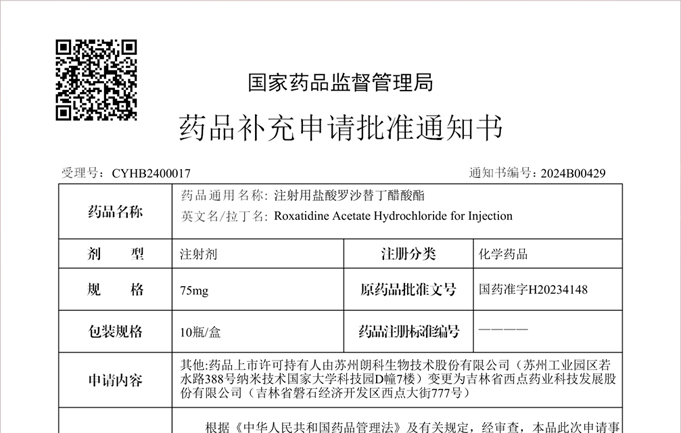 公司近日收到國家藥品監(jiān)督管理局簽發(fā)的注射用鹽酸羅沙替丁醋酸酯《藥品補(bǔ)充申請(qǐng)批準(zhǔn)通知書》,同意按照《藥品上市后變更管理辦法(試行)》相關(guān)規(guī)定,批準(zhǔn)本品上市許可持有人由“蘇州朗科生物技術(shù)股份有限公司”變更為“吉林省西點(diǎn)藥業(yè)科技發(fā)展股份有限公司”,藥品批準(zhǔn)文號(hào)不變。